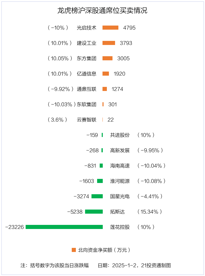 机构净卖出的个股中,金额最多的是国星光电(002449.SZ),当日收盘下降4.41%,换手率为39.92%。 北向资金净买入7股,净卖出7股1月2日,北向资金参与龙虎榜中的个股共有14只,所有净卖出1.95亿元。其中沪股通净买入3股,净卖出3股,所有净卖出2.17亿元;深股通净买入4股,净卖出4股,所有净买入2172.78万元。 北向资金净买入金额最多的是光启本领(002625.SZ),净买入4795.42万元,占总成交金额的1.49%。净卖出金额最多的是莲花控股(600186.SH),为2.32亿元,占总成交金额的7.44%,当日收盘飞腾10%,换手率为28.82%。