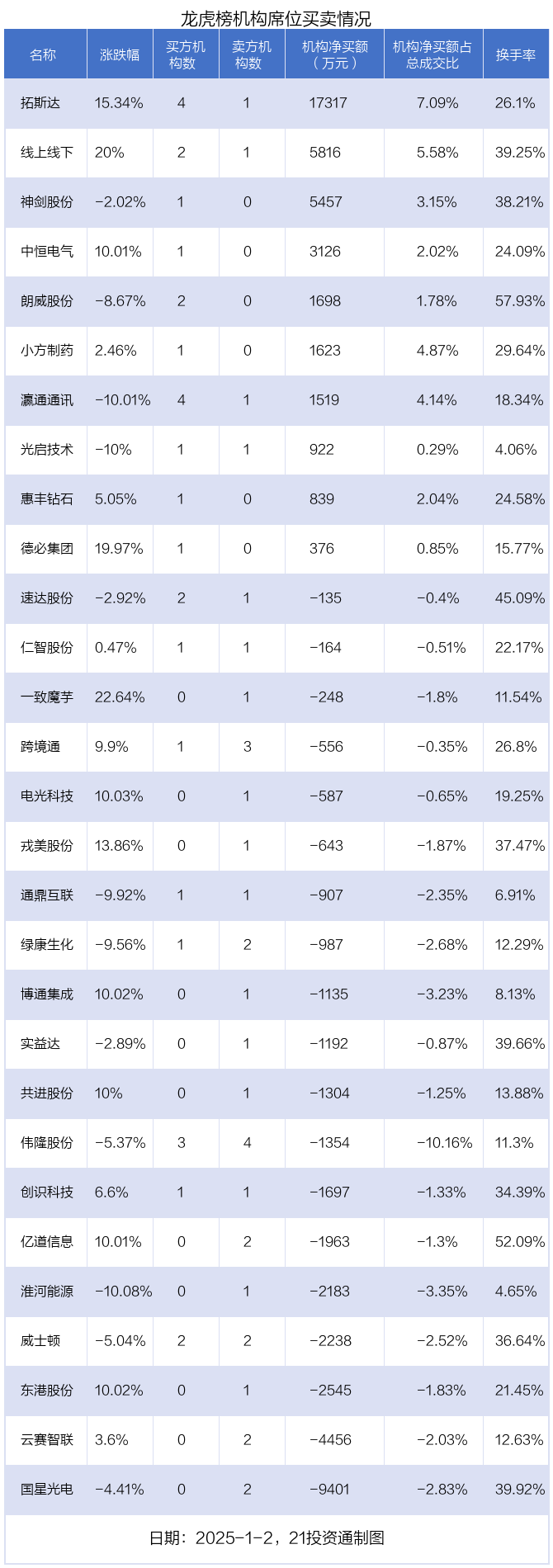 而龙虎榜中资金净流出最多的是莲花控股(600186.SH),被净卖出为3.87亿元,占总成交金额的12.41%。莲花控股收盘飞腾10%,换手率为28.82%。  机构净买入10股,净卖出19股1月2日,29只个股龙虎榜出现了机构的身影,机构所有净买入4997.6万元。具体来看,机构净买入10股,净卖出19股。 其中,机构净买入金额最多的是拓斯达(300607.SZ),当日收盘飞腾15.34%,换手率为26.1%。