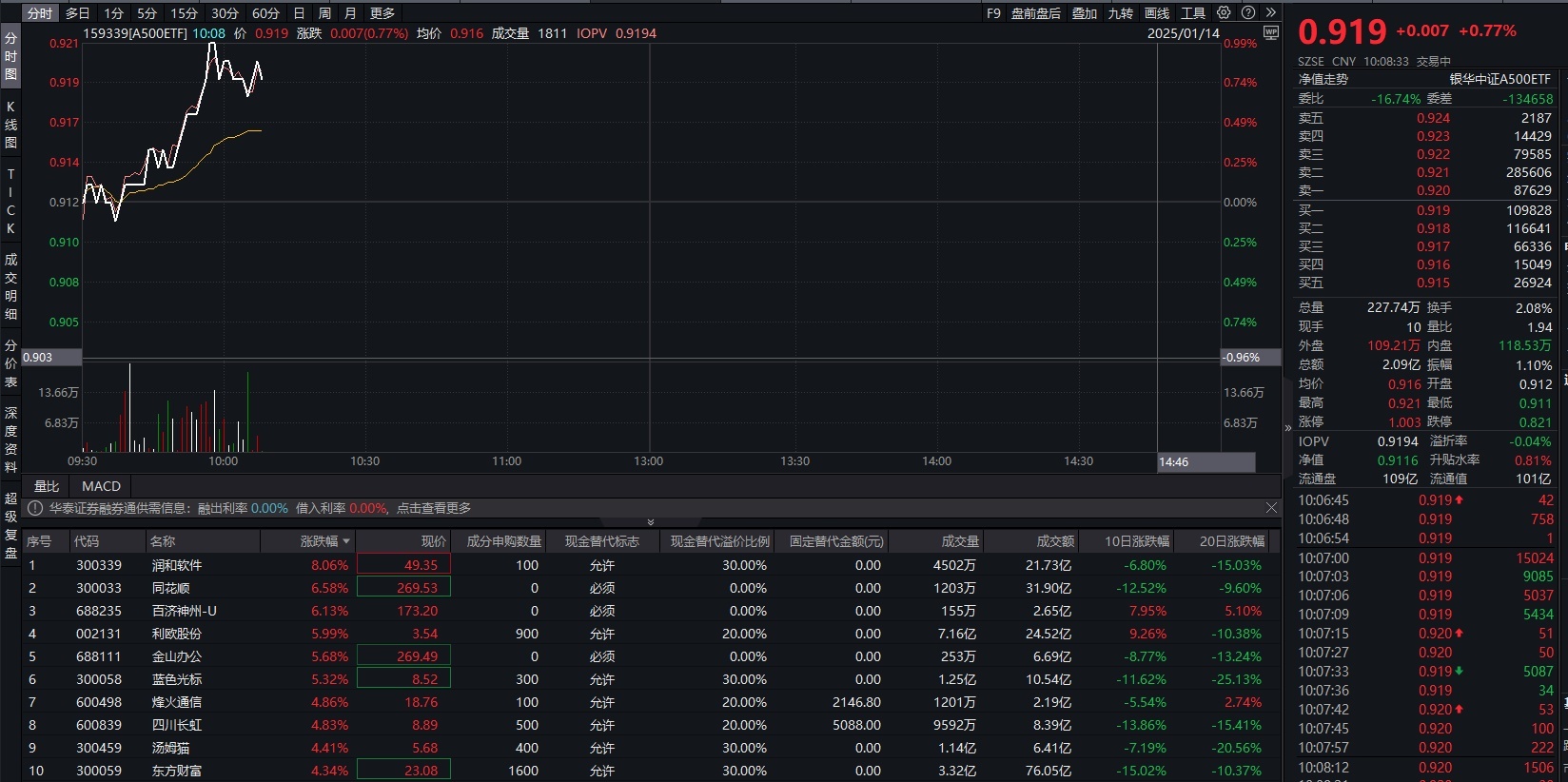 终结逸稿,中证A500涨1.48%。关系ETF方面,A500ETF(159339)涨0.1.43%。因素股方面,润和软件涨8.06%,同花顺涨6.58%,百济神州-U、利欧股份、金山办公等股涨幅居前。